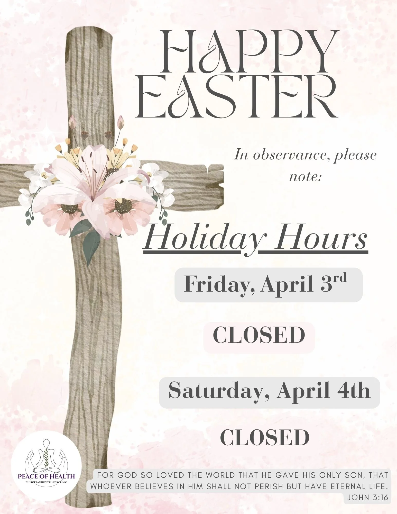 In observance of Easter, our clinic will be closed Friday, April 3rd & Saturday, April 4th