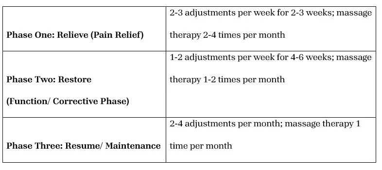 This relaxation of muscle and fascia allows the chiropractic adjustment to flow more easily as we seek to change how your body patterns function. This is not a “one-and-done” situation, as improper movement patterns and muscle memory must be reset and retrained to function more optimally once again. For this reason, we typically recommend more frequent treatment and as your body adapts, we decrease the frequency of care to match your body’s requirements as you progress. This typically looks like one or two chiropractic adjustments per week coupled with once per week, or every other week massage therapy sessions, thus allowing us to attack the dysfunctional neural patterns causing your pain and biomechanical dysfunction. So, a sample treatment plan may appear as follows: